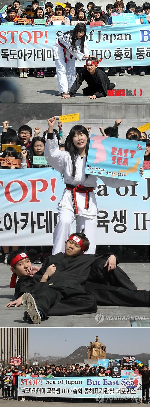 【ソウル=ニューシス】パク・サンフン記者= 1日午前ソウル、光化門(クァンファムン)広場で独島(ドクト)アカデミー教育生が'SEA OF JAPAN'単独表記を支持した米国務省と英国外務省を糾弾するパフォーマンスを行って東海(日本海)を'EAST SEA'で表記することを促している。